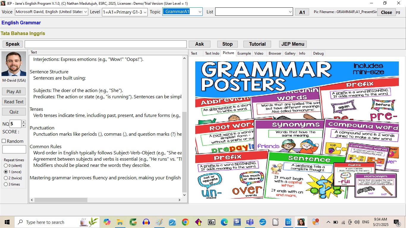 Demo Features: Grammar A1, Vocabulary 500 words, Conversation practice, AI voice