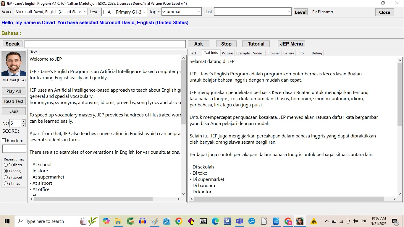 JEP (Jane’s English Program) adalah aplikasi pembelajaran bahasa Inggris berbasis Artificial Intelligence (AI) yang membantu pengguna belajar dengan mudah, cepat dan efektif.